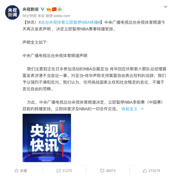 NBA 火箭隊總經理 Daryl Morey 在上周六(5號)發表「支持香港,爭取自由」的言論,中國因而斷絕了和火箭隊的合作,包括轉播、贊助等。惟 NBA 總裁 Adam Silver 仍不懼於此,在其 Twitter 上公開支持 Morey 行使他的言論自由,令中國的禁制延至整個 NBA。大陸中央廣播電視總台央視體育頻道今天在微博宣佈,立即暫停 NBA 季前賽(中國賽)目前的轉播安排。