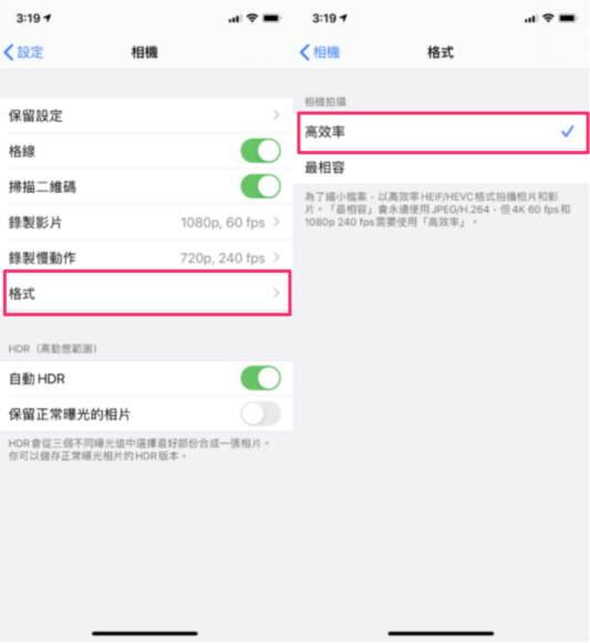 iPhone 用戶檢查現時使用的相片儲存格式,可打開「設定」App,進入相機>格式,選取「高效率」選項便可。