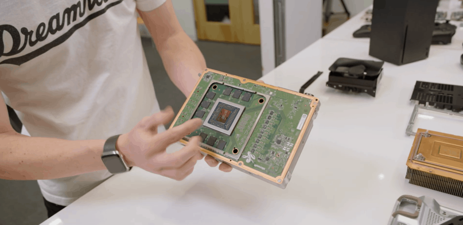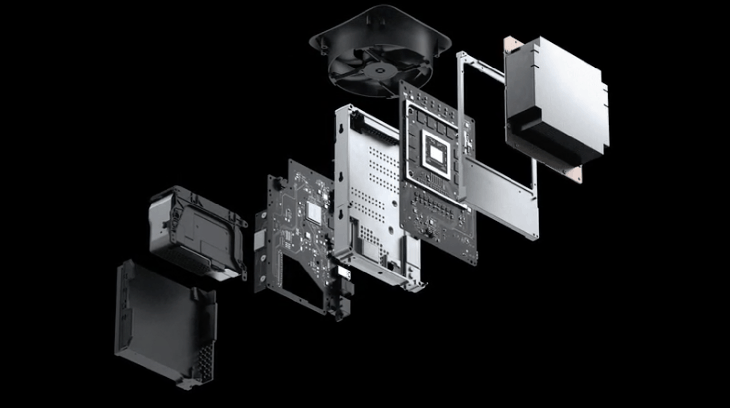 Xbox Series X 採用雙主機板設計與獨特散熱架構,除了在處理器、圖形處理器之上設有大型金屬冷卻裝置之外,兩塊主機板的中間用上金屬框架固定,配合面積幾及整部主機的巨型散熱扇,設計有點像過往蘋果 Mac Pro 電腦。