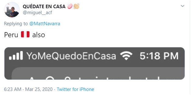 不少人回覆Navarra的貼文指其他地區都出現了相似的訊息,並以不同的語言去表示。其中包括羅馬尼亞文” Stamacasa”、土耳其文” EvdeKal” 、西班牙文” DiRumahAja”. 亦有人指比利時、法國、印度和尼日利亞都出現了英語或當地語言的訊息呼籲市民留在家中。