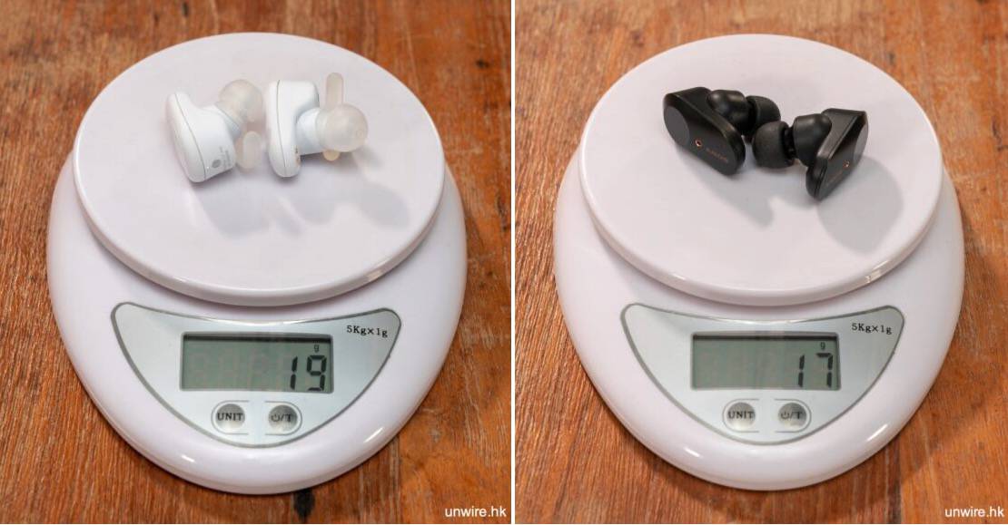WF-SP800N 電池續航力增強,可喜的是其重量沒有因而大幅增加。在電子磅之下,WF-SP800N 一對耳機的重量亦只有 19g,相比 WF-1000XM3 的 17g 只重了 2g。而充電盒就有顯著的輕量化,雖然整體電量略為減少,但重量只有 58g,比起 WF-1000XM3 充電盒的 75g,可說是取得一個較好的平衡,想帶著充電盒出外跑步也不會太累贅。不過其體積相比起市面其他同類產品稍為大一點。