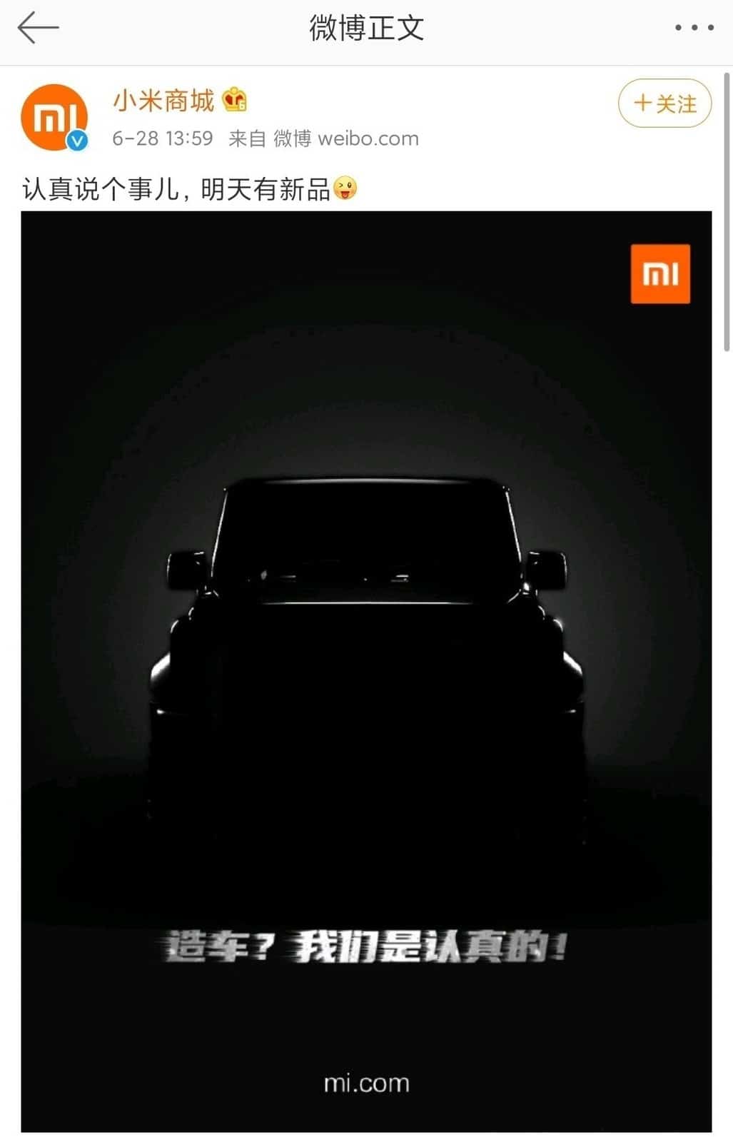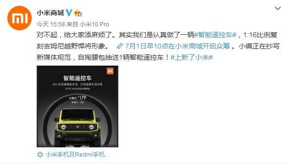 該「造車?我們是認真的」微博及後已經刪除,而小米商城亦作出解釋,原來小米將會推出的是一部售價 199 人民幣的 1:16 比例 Suzuki Jimny 智能遙控車,並且會在 7 月 1 日早上開賣。