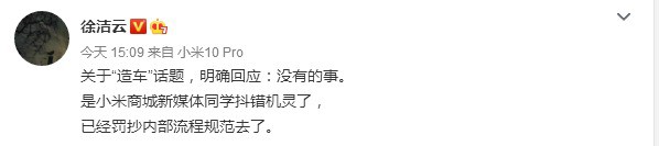 在經過網民和媒體的熱烈討論後,小米集團公關部總經理徐潔雲昨日(6 月 28 日)下午在微博澄清,表示小米並不是生產汽車,只是小米商城的新媒體部門員工捉錯用神,已經作出了內部懲處。