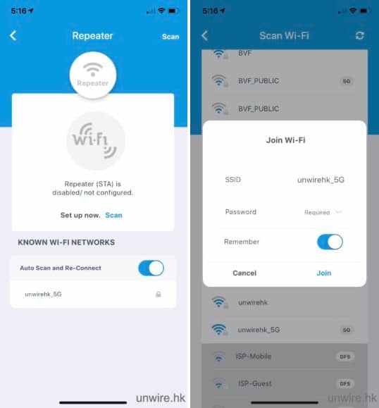 ▲想中繼 Wi-Fi,在路由器設定畫面進入「Repeater」,掃描並登入現有 Wi-Fi 網絡,路由器就可中繼此 Wi-Fi 上網連線。