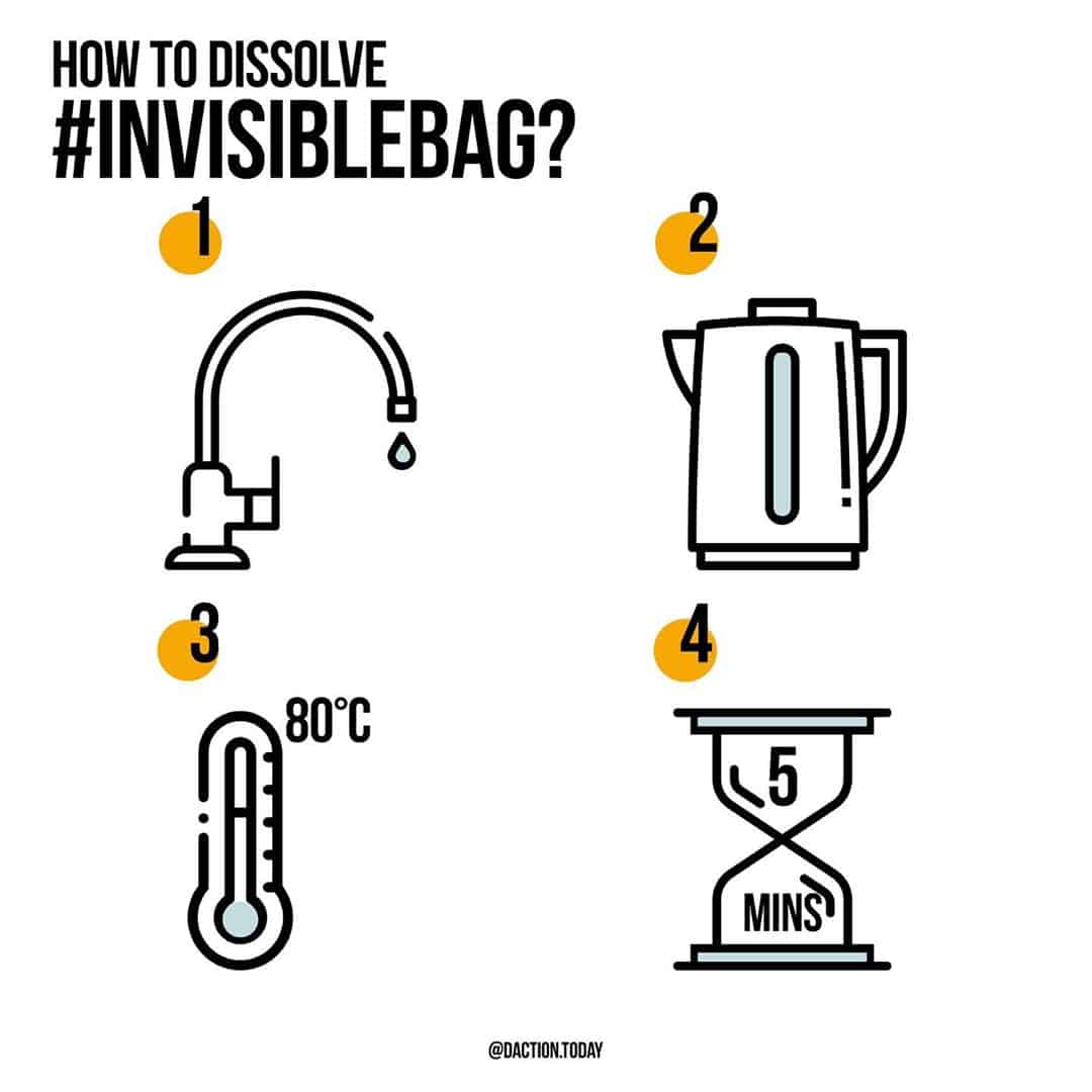 雖然說 Invisible Bag 是一個膠袋,實際上它並沒有塑膠成份,它由聚乙烯醇(PVA)、植物澱粉、甘油和水製成,說穿了就是食用膠囊的物料。Invisible Bag 沒有塑膠難以分解和破壞環境的缺點,當用戶決定不再循環使用 Invisible Bag 時,只要將它放入攝氏 80 度以上熱水浸泡和攪拌,Invisible Bag 就會慢慢溶化,剩下的物質會像廁紙的殘渣浮於水面,但殘渣本身不含毒素,對環境無害,能夠直接都有水槽沖走。