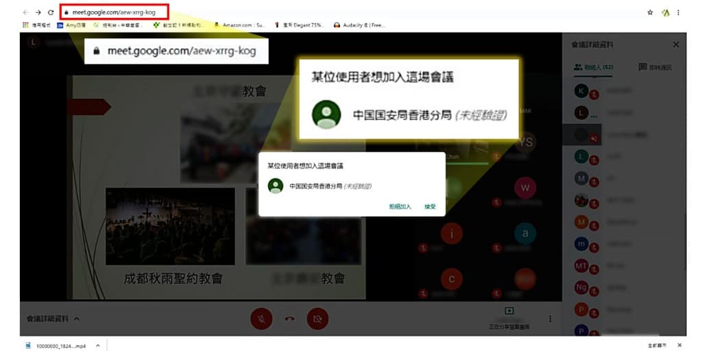 根據本地傳媒「眾新聞」報道,中華基督教會屯門堂在周日(30 日)會以網絡 Google Meet 視像方式舉辦四堂「紅旗下十架的歷史變遷」課程,然而課程進行至第三課的時候,分別有自稱「中國國安局香港分局」、「中國國家安全局」、「Shenzhengovernment」(深圳政府)的用戶要求加入。堂會當時拒絕該些請求,但其後的課堂卻受到數十次的干擾,更有第三方不斷移除參加者及主持人牧師,令課程被逼終止。