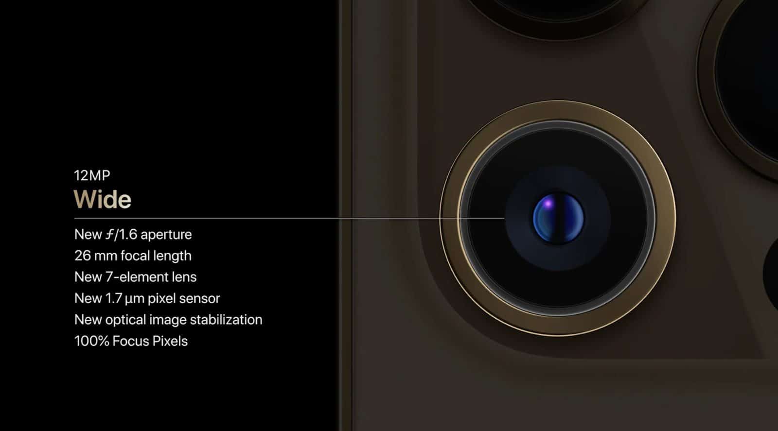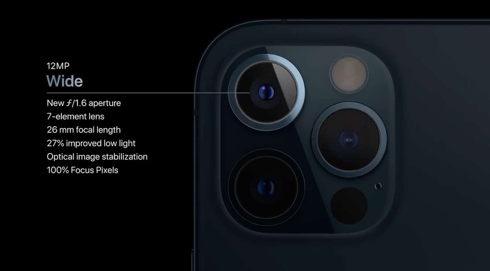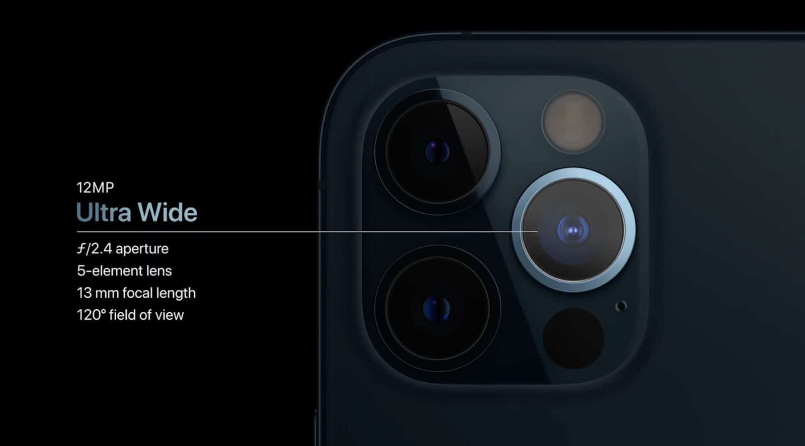 iPhone 12 Pro 相機雖然同樣為 1200 萬像素,但在超廣角相機裡面的感光元件,其面積比起其他機種將大 47%,能夠提供 87%夜攝效能提升。iPhone 12 Pro與 Pro Max將支援 iPhone ProRAW 全新格式,相機會利用所有處理器元素處理相片。光暗分明的相片當中的較暗位置將會有更細緻的表現。