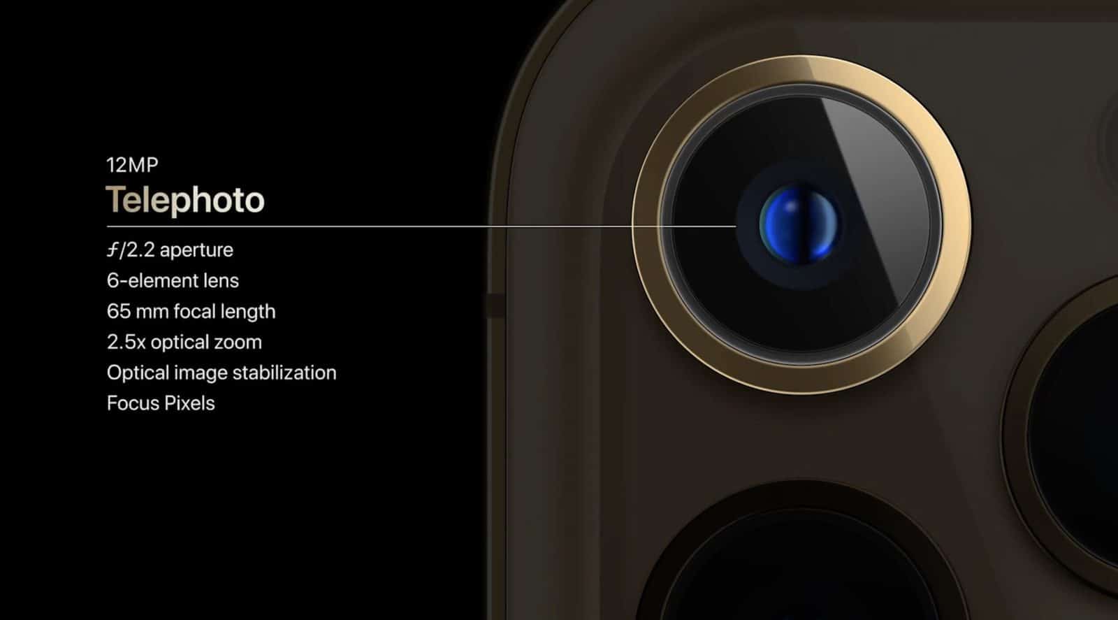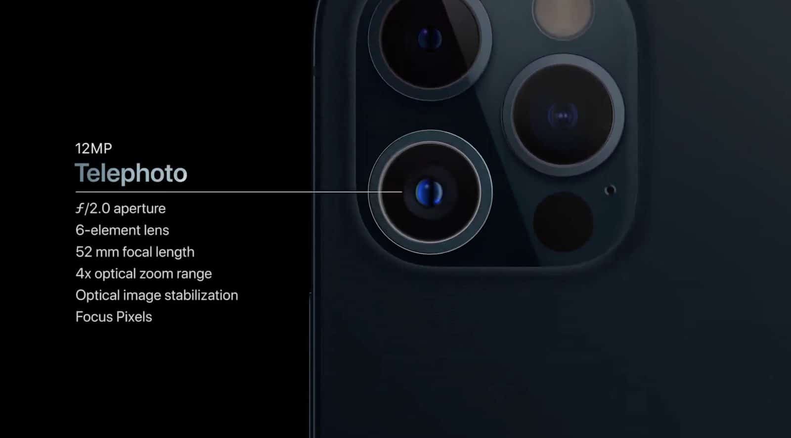 iPhone 12 Pro 將設有4鏡頭設計的相機系統。除前置相機外,後置主相機將包含一個 1200萬像素超廣角鏡頭、一個 1200 萬像素 f/2.2 遠攝鏡頭,可提供 2.5 倍光學變焦並支援防手震功能。iPhone 12 Pro 還有一個超遠攝 f/2.0 鏡頭,它的焦距為 52mm,而 iPhone 12 Pro Max 將會搭載另一款焦距為 65mm 的長焦距鏡頭,提供最大 2.5 倍光學變焦。
