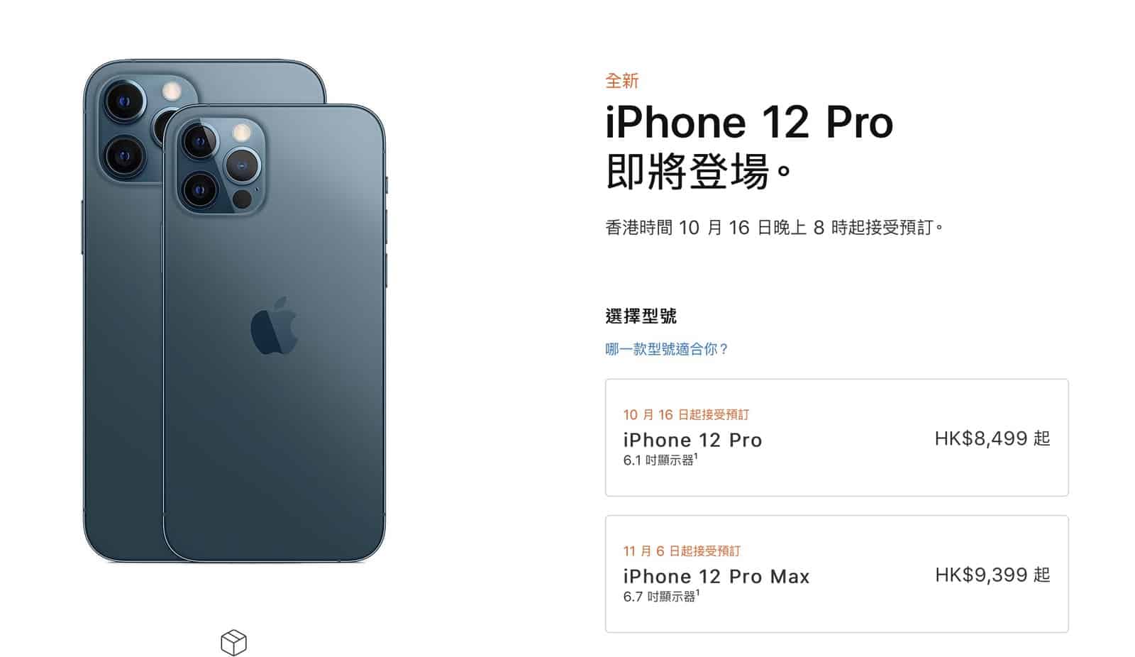 香港時間 10 月 16 日 (星期五) 晚上 8 時起可預訂 iPhone 12 Pro,於 10 月 23 日 (星期五) 起開始發售;並將可由香港 11 月 6 日 (星期五) 晚上 9 時起預訂 iPhone 12 Pro Max,於 11 月 13 日 (星期五) 起開始發售。
