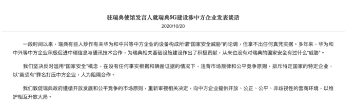 而中國駐瑞典使館發言人則回應,堅決反對濫用「國家安全」概念,在沒有事實根據下,排斥特定國家的特定企業,以「莫須有」罪名打壓中方企業。亦認為華為和中興等中方企業一直為瑞典相關基礎建設作出貢獻,從來沒有對瑞典的國家安全有過任何「威脅」。