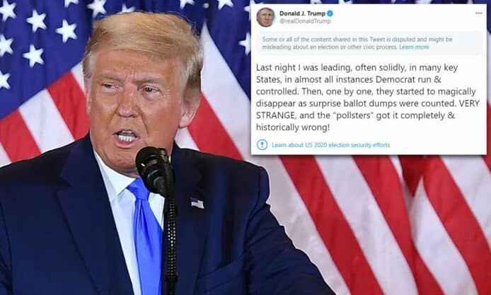美國總統大選結果陸續公布,競逐連任的總統特朗普在 Twitter 發文,表示自己原本領先多個關鍵州份,但因為有大量選票意外被清點,令他的優勢一個接著一個消失,表示情況「非常奇怪」。但其後 Twitter 將帖文標籤為「部分或全部內容出現爭議且可能產生誤導」,並禁止網民在該帖文留言,Twitter 稱以防止該信息傳播給更多人,因此「停用大部分與其互動的方式」。而特朗普發表與選舉相關的數個帖文都再度被標籤為「可能產生誤導」,及被禁止留言。