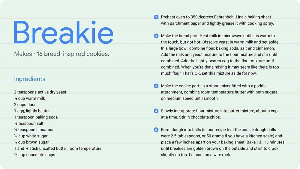 我們煮食時往往會參考食譜,很多都是前人經驗累積的成果,未來我們在網上尋找食譜,有可能是由人工智能的創作。最近 Google 公佈了兩款全新食品 Cakie 和 Breakie,其食譜就是透過訓練人工智能後所得的成果。