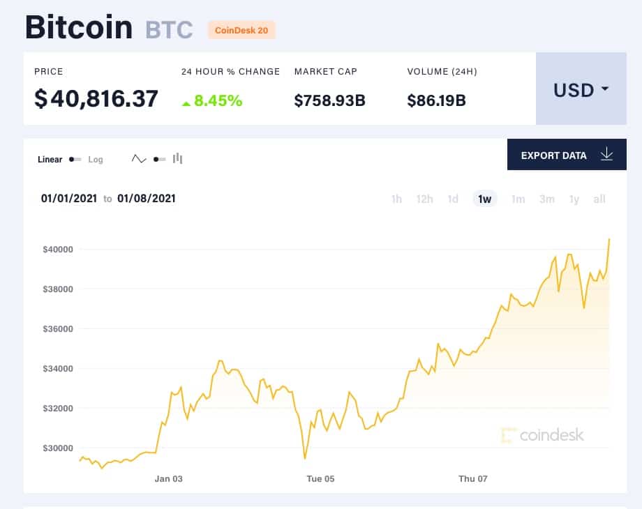 Bitcoin 升穿 40000 美元後曾回落 3000美元,但在本文截稿時已重新升回 4 萬美元,報 40,816.37 美元。
