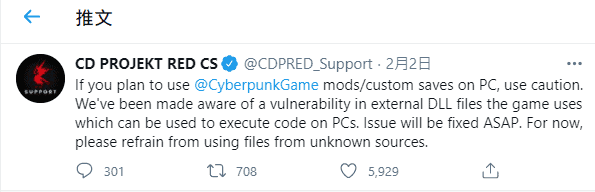 《Cyberpunk 2077》面世後,遊戲已經開發出大量的mods,有一些非常實用,例如 Cyber Engine Tweaks。它可以有效修正遊戲中的 Bugs,還有一些 mod 能夠改善車輛操作等遊戲體驗。不過根據 Romulus_Is_Here 在 Reddit 上的帖子,遊戲的 DLL 檔案中存有一個漏洞,此漏洞可讓一些藏有惡意程式碼的 mods 以及遊戲存檔存檔,能夠透過遊戲入侵玩家的電腦系統,取得電腦控制權,並通過文件竊取玩家的數據。