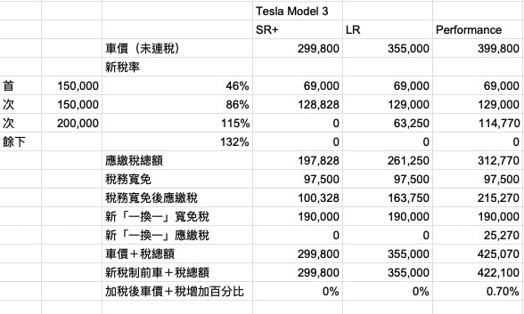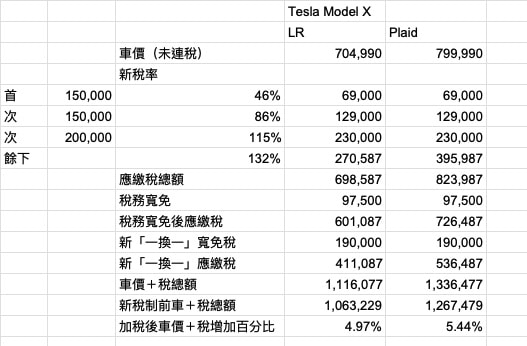 再計算 Tesla 較高階車款,Tesla Model S 與 Model X 受首次登記稅加稅的影響較大,應繳稅總額由 61.9 萬至 95.6 萬不等,即使「一換一」稅務寬免上限有所提升,應繳稅仍比過往有不同升幅,令連稅後的總車價有 4.57% 至到 5.80% 的升幅。「一換一」稅務寬免新上限將不能完全彌補首次登記稅加稅所帶來的應繳稅增幅。