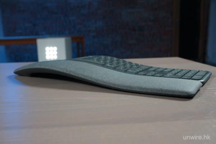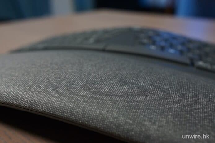 另外,ERGO K860 配備隨著鍵盤弧形打造的兩層式手托,支撐層以 2mm 高密度記憶海綿均勻分散壓力,而舒適層則透過 4mm 記憶海綿強化整體舒適度,表面採用耐用、抗污以及易清潔的塗層與 0.5mm 針織布料包覆。手托整體感覺不錯,表層相當滑亦不會過軟,有足夠承托力。而雙手放於手托上輸入,感覺上亦比平常標準鍵盤輕鬆。不過值得留意的是,手托與鍵盤是連在一起不能拆卸的。
