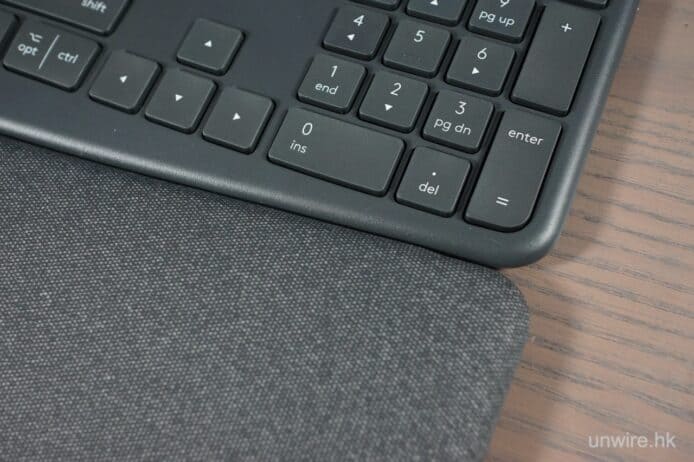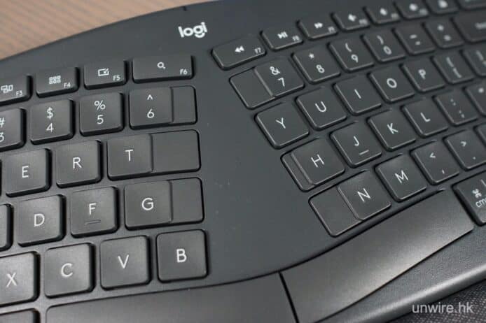而 ERGO K860 為設有數字鍵盤的全長鍵盤,上面更設有一些特別的長型按鍵,例如 G、T、H、N、6 及 7 等,都分別增長了一段。Logitech 指此舉有助模擬標準鍵盤的感覺,可以幫助使用者適應並從標準鍵盤過渡至人體工學鍵盤。不過平常使用標準鍵盤的小編,並未有覺得增長的按鍵對適應有很大幫助,不過按鍵增長後倒是比較美觀。