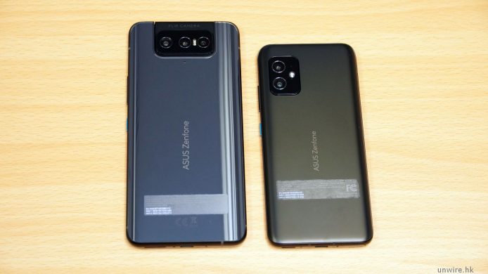 ▲上面左邊就是 ZenFone 8 Flip,右邊就是 ZenFone 8,大家可以見到兩部機都是用上了幼邊框屏佔比高的正面設計,但 ZenFone 8 明顯細了不少。