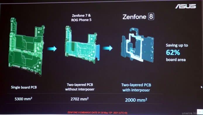 ▲為了要縮細機身,ASUS 重新設計手機底板,大家可以見到它的底板比上代 ZenFone 7 或早前推出的 ROG Phone 5 電競手機細了 26%。