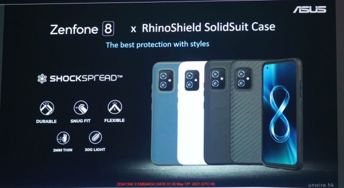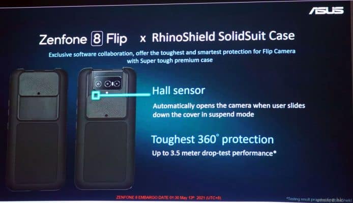 ▲ASUS 更首度與 RhinoShield 合作,推出專為 ZenFone 8 Flip 而設的保護殼。它除了可為 ZenFone 8 Flip 提供更周全的保護,即使從 3.5 米高的位置跌手機落地面,都不會令手機有所損傷,更重要是它內建感應器,只要在待機情況下打開鏡頭保護蓋,就會自動開啟相機拍照,十分方便。