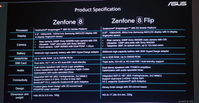 ▲ZenFone 8 及 ZenFone 8 Flip 的詳細規格。