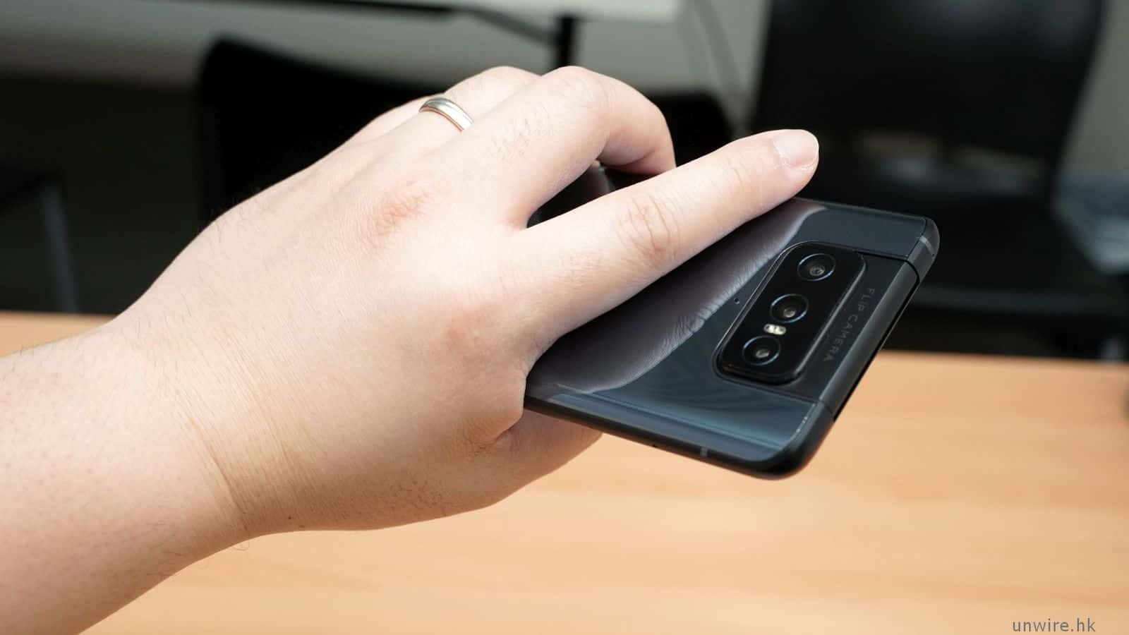 ▲由於機身設計大致上與上代 ZenFone 7 相同,所以拿在手上的手感也是一樣:比較厚及重一點,不過單手操控還算舒服,只是點按熒幕較近頂部位置會比較困難。