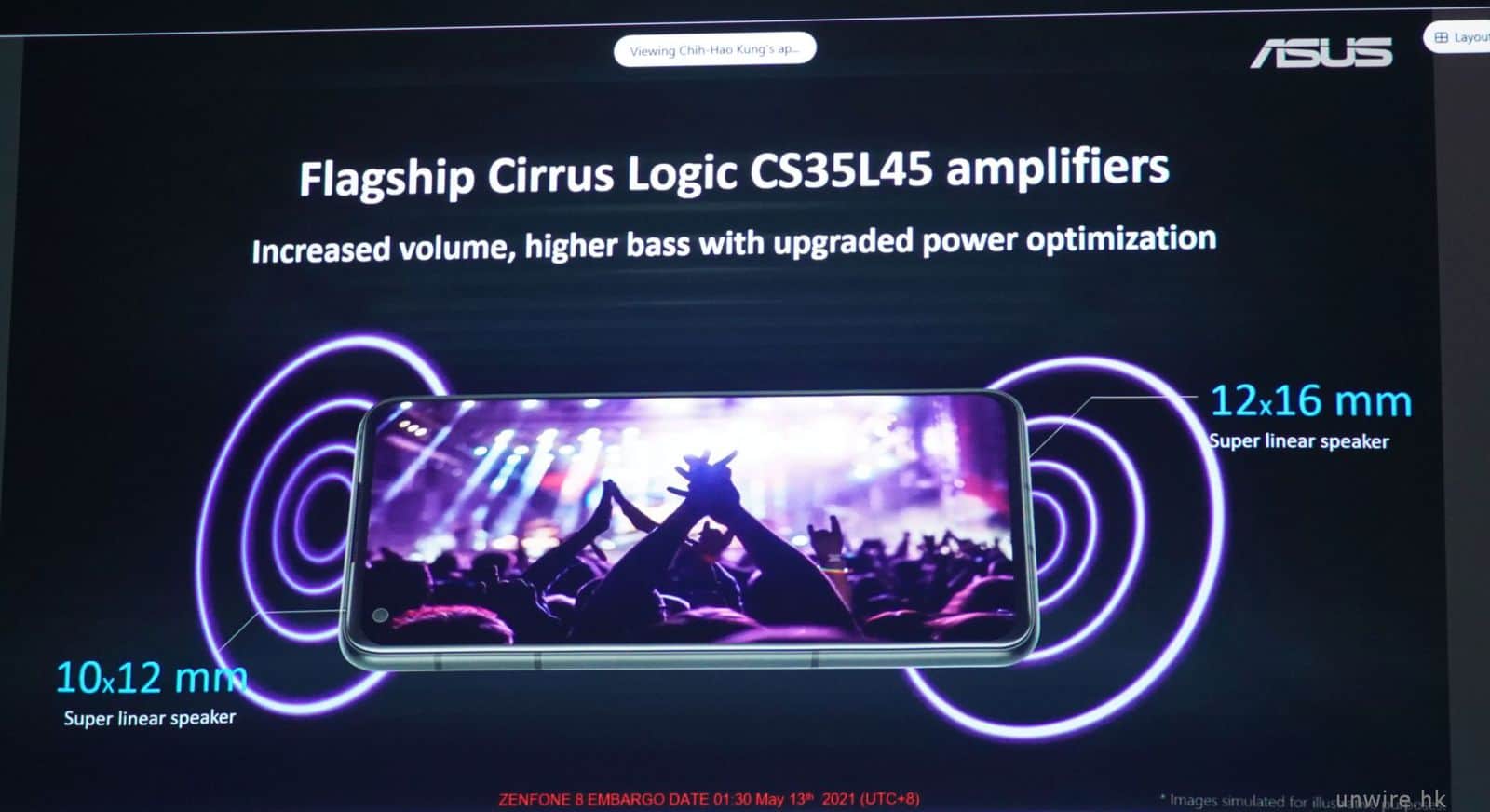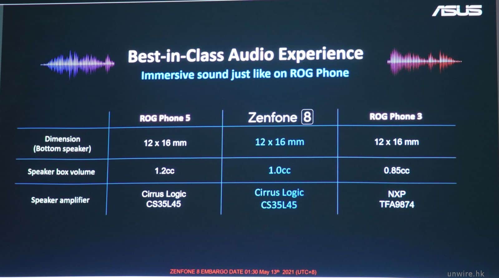 ▲ZenFone 8 雖然機仔細細,但也內建立體聲喇叭,而且單元大細更不會比機身較大的 ROG Phone 5 細很多。