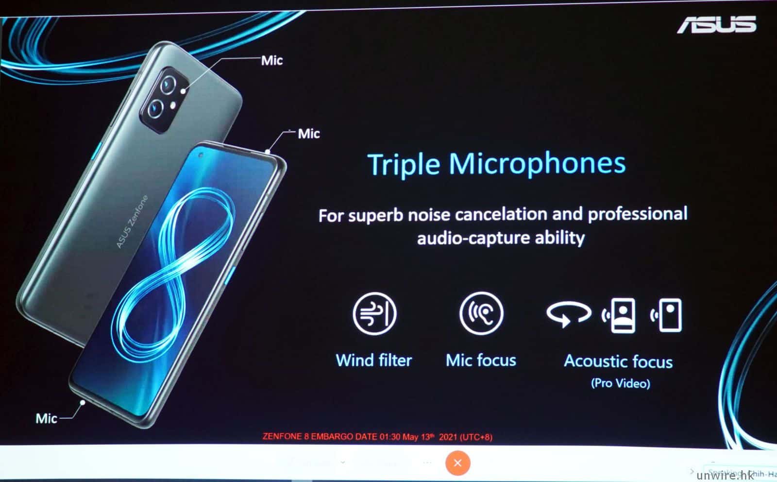 ▲ZenFone 8 更內建 3 咪高峰設計,咪高峰更設有防風及集中人聲功能,收音效果十分不錯。