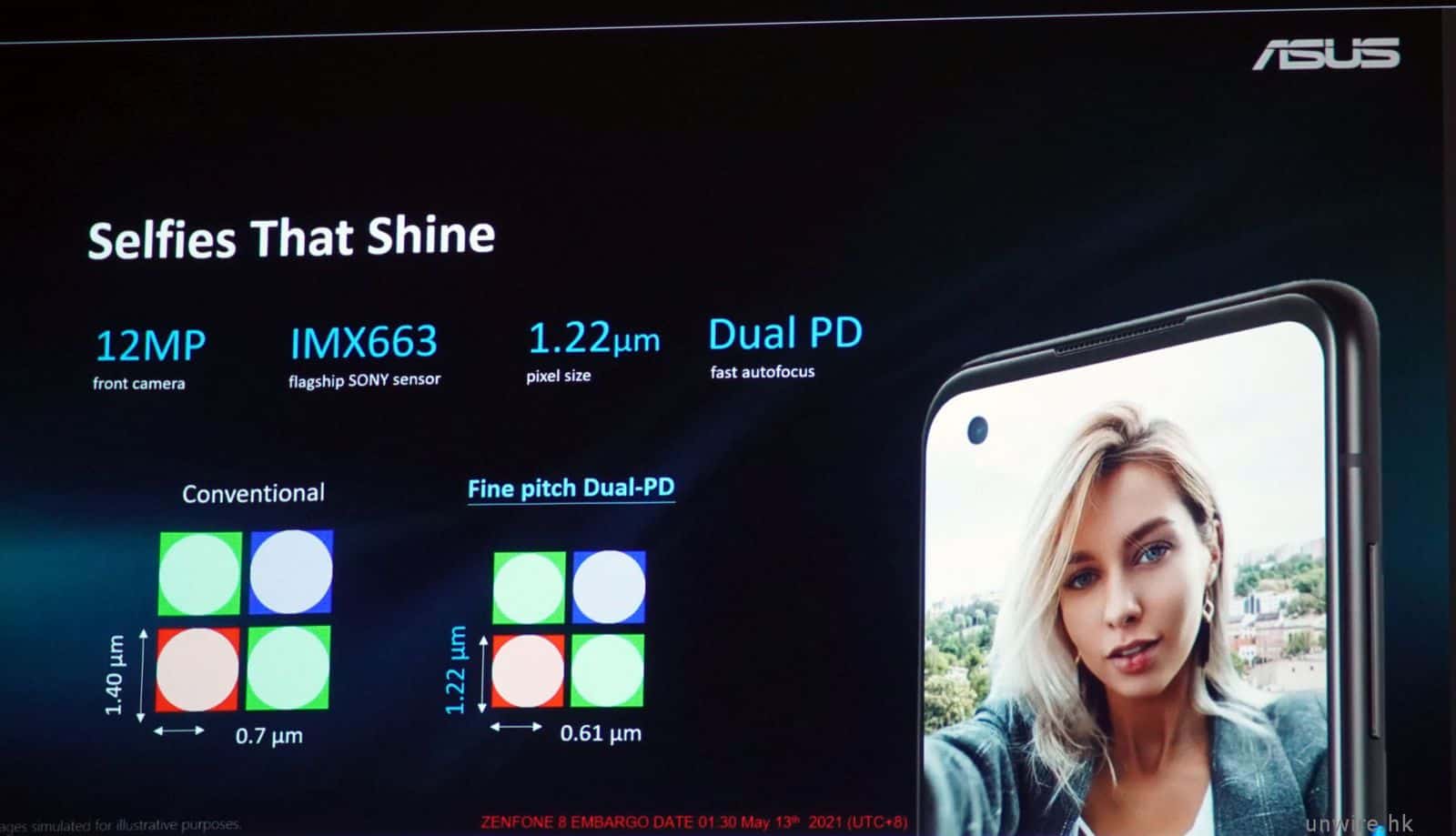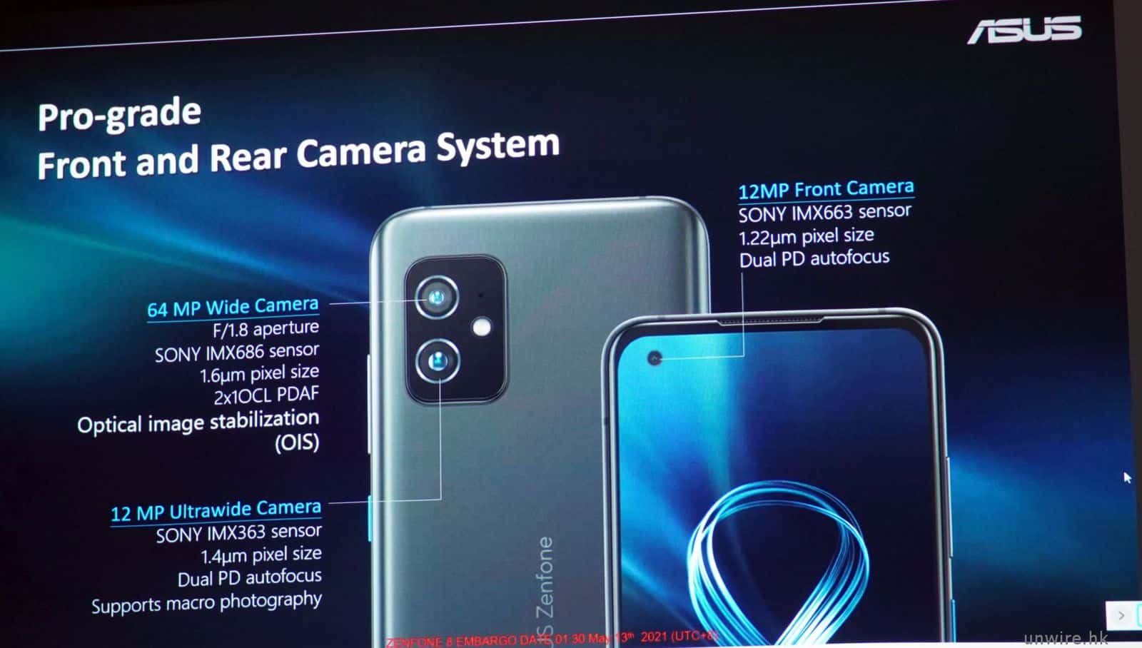 ▲鏡頭配置方面,ZenFone 8 機背設有 6,400 萬像素主攝鏡及 1,200 萬像素超廣角鏡,而前置鏡頭則為 1,200 萬像素。