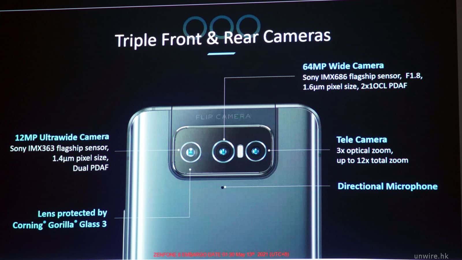 ▲ZenFone 8 Flip 的 3 主鏡與上代相同,由左至右同樣是 1,200 萬像素超廣角鏡頭、6,400 萬像素主攝鏡頭及 800 萬像素遠攝鏡頭。