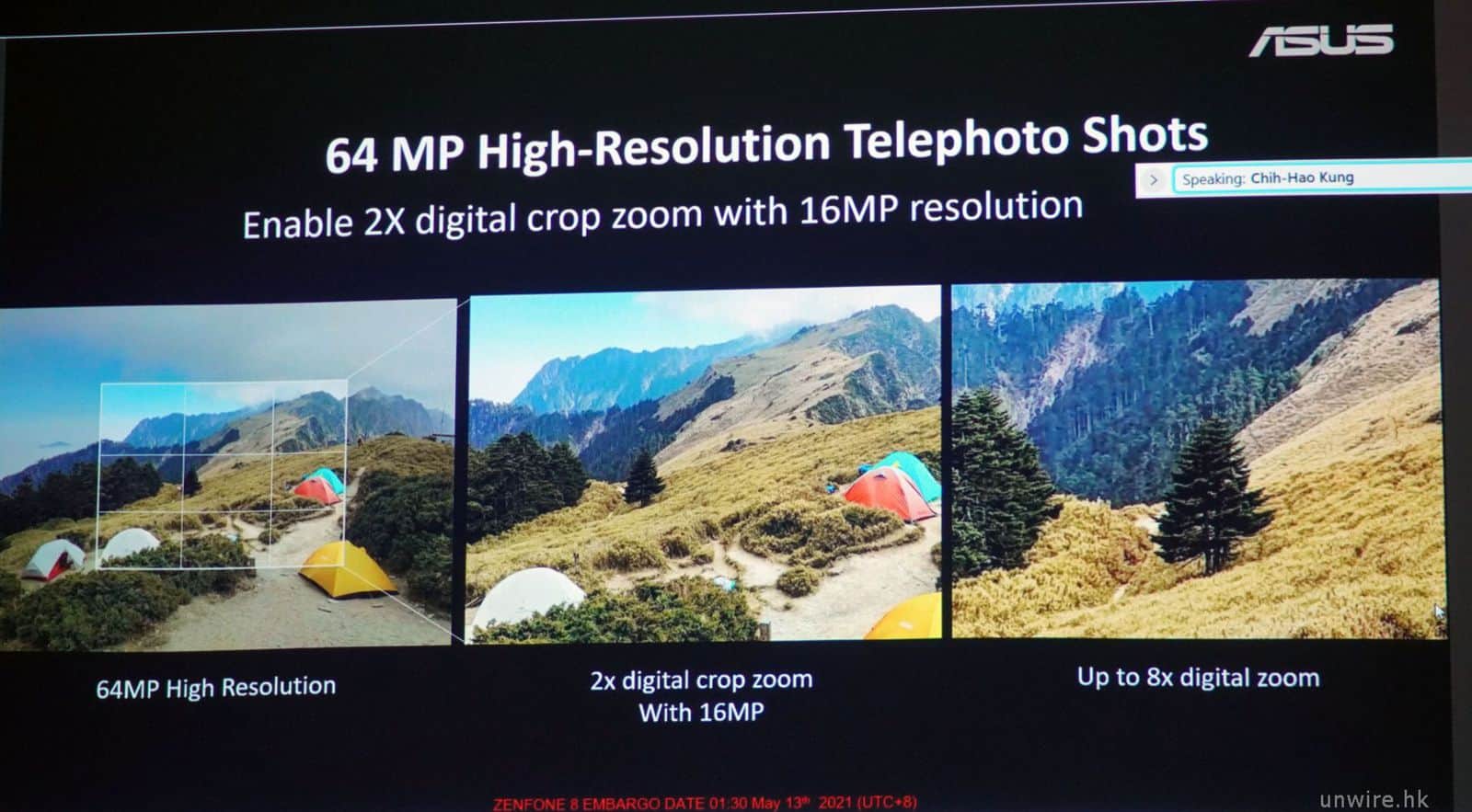 至於 ZenFone 8 方面就比較特別,它採用傳統位於機背的主鏡頭設計,而非 ZenFone 8 Flip 的翻轉鏡頭。相比 ZenFone 8 Flip,它同樣是 3 鏡頭設計,不過是雙主鏡(6,400 萬像素主攝鏡及 1,200 萬像素超廣角鏡)及單前鏡(1,200 萬像素)的配置,相比 ZenFone 8 Flip 確實似乎是失色少少。至於相機質素,筆者就只能留待實機到手後,再為大家測試一下了,但初步看來也算不錯,只是 ZenFone 8 沒有了遠攝鏡,拍攝遠處事物效果會沒有 ZenFone 8 Flip 那麼好而已,但如果大家要求不太高,其實都不會有太大投訴。