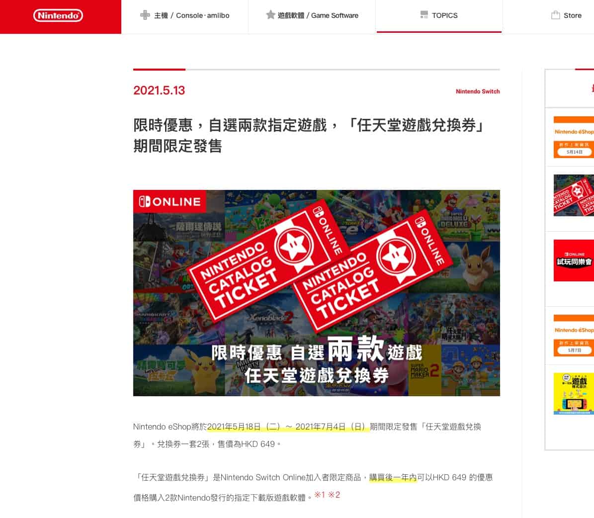 任天堂日前宣佈港服將於 5 月 18 日至 7 月 4 日期間限時推出「任天堂遊戲兌換券」,只需港幣 $649 便可在購買後一年內,兌換兩個任天堂在有效期限內發售的指定下載遊戲,不過要留意 $324 以下的遊戲並不能兌換。而 2 張兌換券可以分開使用,例如可以先使用 1 張兌換券以兌換 1 個可以馬上開始遊玩的遊戲軟件,另外 1 張留待兌換日後發售的新遊戲軟件。使用方式隨用戶自由安排。