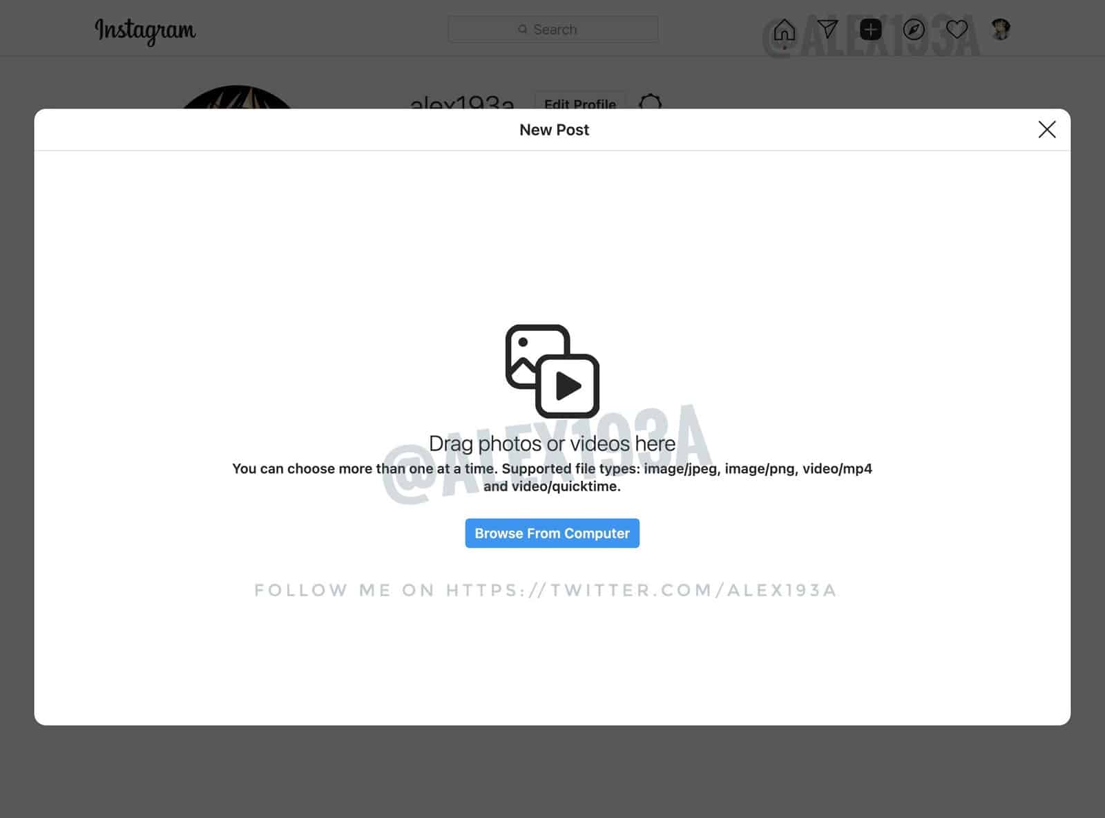 根據爆料者 @alex193a 於 Twitter 的分享,Instagram 將會讓用戶在網站張貼和修改帖文,他還上傳了網頁版的新使用介面,用戶可以將要上傳的相片或影片,以拖放的方式放到 Instagram,亦可以在裁切和添加濾鏡等後製,最後還可以標示相片中的人物或拍攝地點。