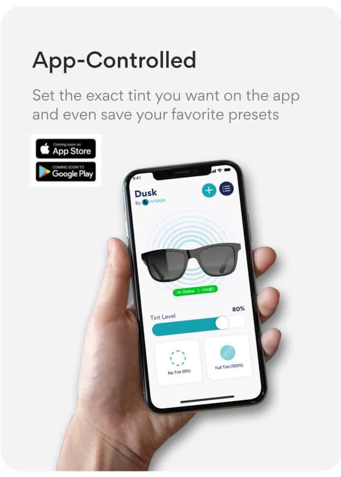 Dusk 眼鏡柄按鈕提供 3 段鏡片色調調節,而手機程式則細緻得多,可以選擇 0% 至 100% 的任何色調,整個切換過程最快 0.1 秒就能完成,手機程式更加可以保存多個偏好設定。Dusk 另外還內置了響鬧功能,當用戶遺失眼鏡時,可以利用手機程式嘗試尋找。Dusk 支援 IP65 等級防水,但廠商不建議將之浸泡於水中;其內置電池可以提供 4 小時音樂播放,或 7 天的簡單色調調節。
