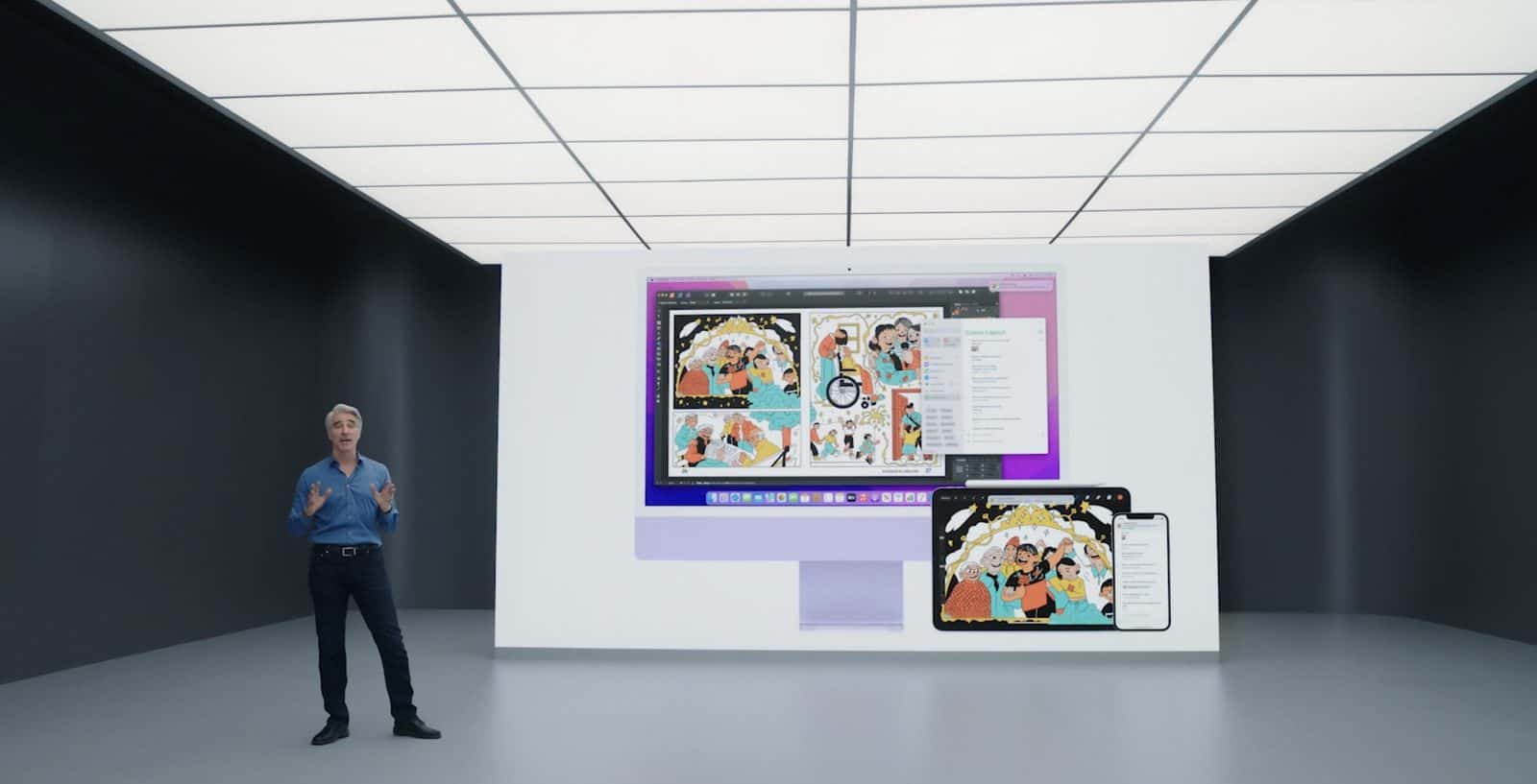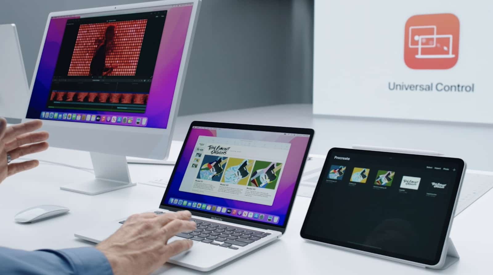 此功能讓用戶使用 Mac 電腦的鍵盤/滑鼠/觸控板同時控制其他鄰近的 Apple 裝置,包括 iPad 與另一部 Mac 電腦。用戶毋須進行設定,例如 iPad 放在 MacBook 旁邊,即可啟動 Universal Control 功能。(以下為發表會中所示範的例子)