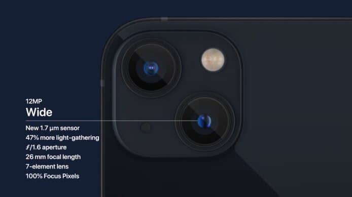iPhone 13 以及 iPhone 13 mini 帶來全新相機感光元件,其 1200 萬像素廣角鏡頭進光量提升 47%,光圈為 f/1.6,焦距為 26mm。全新感光元件讓 iPhone 13, iPhone 13 mini 也支援夜間模式,夜間模式也可使用縮時攝影功能。超廣角鏡頭採用更大光圈之鏡頭,可在低光拍攝環境有更大優勢。