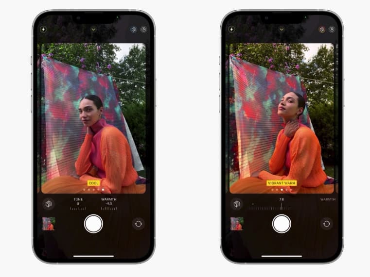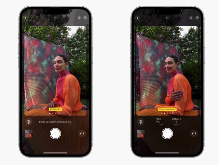 全新 iPhone 13(包括 13, 13 Pro系列) 加入「攝影風格」功能 (Photographic Styles) 功能,可按照攝影者的個人喜好,得到更個性化的攝影效果。iPhone 利用其處理能力,讓用戶自行設定相機的白平衡、曝光、色彩、光線變化,並能夠實時應用到相機中。例如用戶可選擇「高對比度」更鮮明的相片、「高飽和度」可令相片色彩更加突出。Apple 指在調節這些參數時,可保留相片中人物的膚色表現。用戶亦可在拍攝時進一步調節色調、色溫。用戶可將一堆設定好的「攝影風格」儲存,在不同拍攝環境中一叫便可使用。