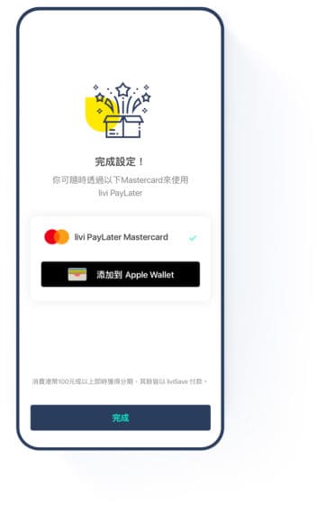 莉莉菇實試也只用了大約三分鐘多一點,過程中不需要提供額外文件,辦妥 livi PayLater 服務後就可於付款當刻,用專屬的 livi PayLater Mastercard 去分期消費。