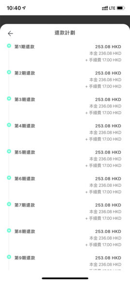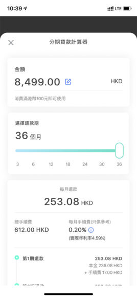 ▲付款後就可在應用程式中看到新簽賬還款安排,手續費及年利率等。