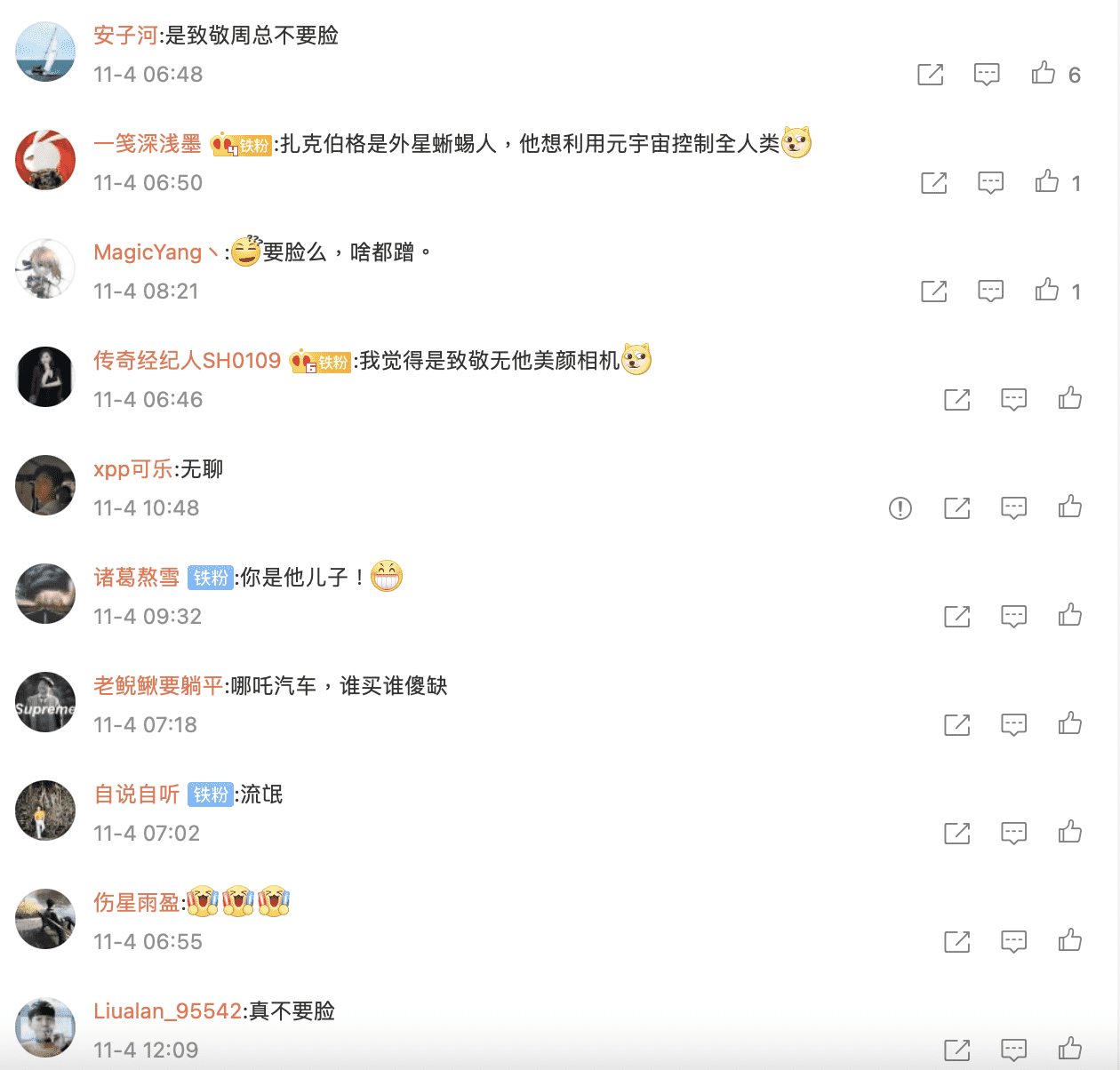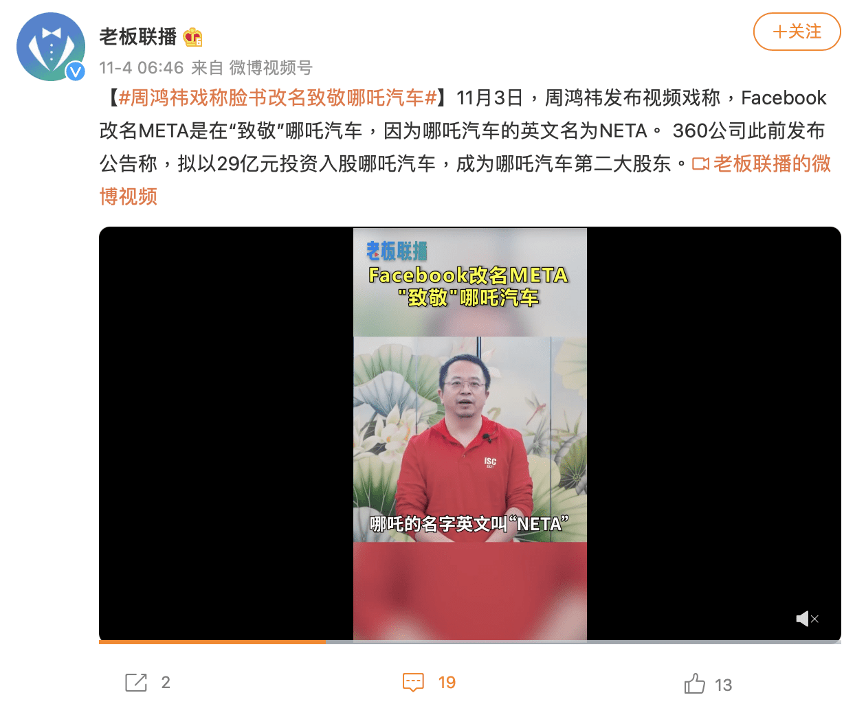 周鴻禕發言表示, Facebook 新名字 Meta 與哪吒汽車的英文名 Neta 只差一字,認為朱克伯格看上了 Neta 而更名,是在向哪吒汽車致敬。中國網民卻不認同周鴻禕的看法,紛紛留言笑他不要臉,只懂「蹭熱度」,指 Meta 是向不要臉的他致敬。