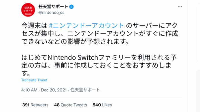 今年的聖誕節剛好是星期六,就連聖誕並非法定假期的日本,人們亦可以與家人朋友盡情慶祝。任天堂日本的官方 Twitter 帳號日前就發出預警,聖誕期間 Nintendo Account 系統會面對高負載,提醒 Switch 用戶們要事先作好準備。