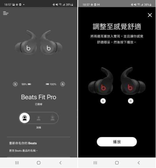 今次 Beats Fit Pro 支援 Android 版 Beats App。用家可在此 App 設定耳朵貼合度測試,更易選擇適合自己的耳塞,APP 內也可自訂按鈕、顯示電池狀態、流暢度更新等等。不過相對 iOS,Android 平台將不會提供「尋找」app 配合、免提聲控「喂Siri」、音訊分享功能、自動切換功能、iCloud 共享功能等等。