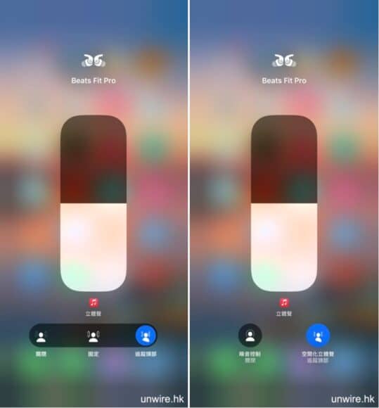 Beats 耳機都加入了空間音訊的支援,在 iOS 的耳機音量選單裡面便可開啟。開啟後系統會建立一個音場空間,耳機內的偵測器偵測到用家的頭部活動,更會動態追隨「聲源位置」。假設演奏者在你的面前演奏,而你的頭顱向左轉的話,聲音便會加強偏向右方耳機傳來的感覺,讓你有種身處於演奏空間的感覺。無論是音樂或者清淡節目,都會加強了臨場感覺。用戶亦可關閉「追蹤頭部」功能,只擴闊聲音驅場感。