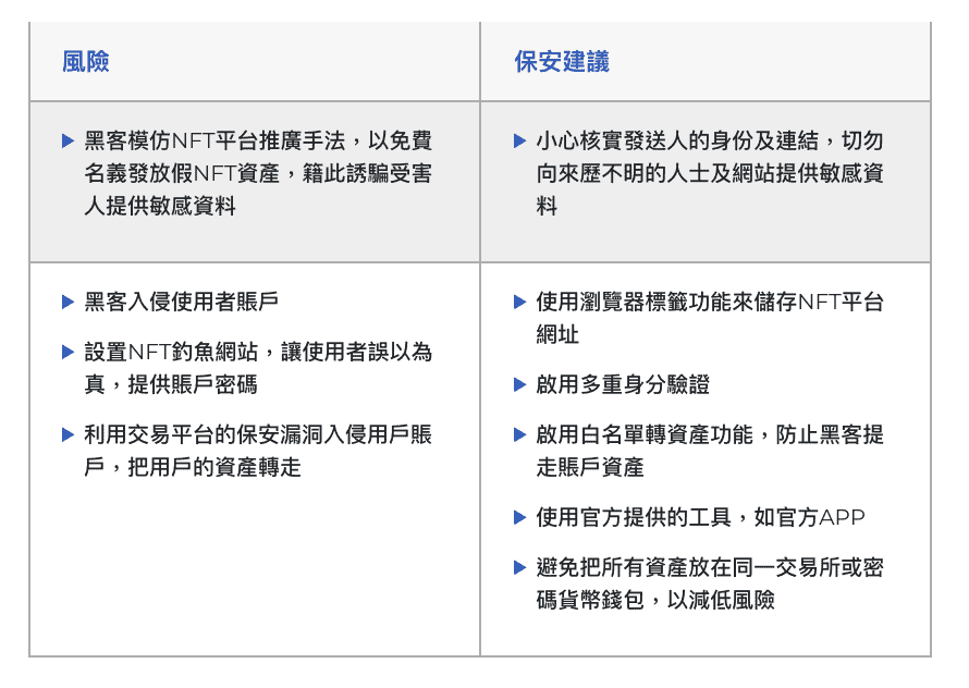 協調中心指,黑客會模仿 NFT 平台推廣手法,以免費名義發放假 NFT 資產、設置 NFT 釣魚網站等手法,籍此誘騙受害人提供敏感資料,或利用交易平台的保安漏洞入侵用戶賬戶,將用戶資產轉走。協調中心建議購買 NFT 時,應小心核實發送人的身份及連結,切勿向來歷不明的人士及網站提供敏感資料、啟用多重身分驗證及白名單轉資產功能,防止黑客提走賬戶資產。
