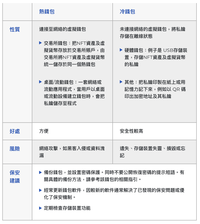 熱錢包是需要連接至網絡的虛擬錢包,其中包括交易所錢包和桌面或流動錢包。以交易所錢包為例,是指把NFT資產及虛擬貨幣存放於交易所賬戶,由交易所將NFT資產及虛擬貨幣統一儲存於同一個熱錢包。其好處是較為方便,但易受網絡攻擊,如黑客入侵或資料洩漏;冷錢包則是未連接網絡的虛擬錢包,將私鑰存儲在離線狀態,例如在USB裝置存儲NFT資產及虛擬貨幣的硬體錢包便是冷錢包。其好處是安全性較高,但容易遇上遺失、存儲裝置失靈、損毀等情況。