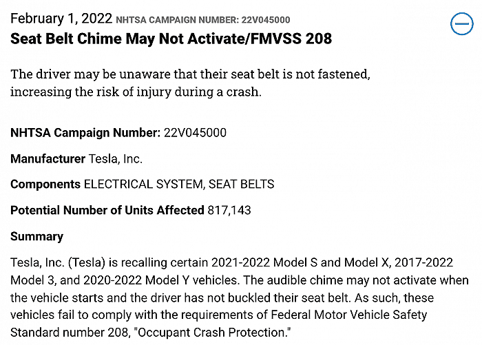 美國法例規定,所有車輛皆需配備蜂鳴器,為車輛已啟動而未佩戴安全帶的駕駛者發出提示聲效。美國國家公路交通安全管理局(NHTSA)發現,有 Tesla 沒有在駕駛者未熄匙而下車的情況下啟動蜂鳴器,雖然儀表板上的提示燈號仍正常運作,但提示聲效能提醒駕駛者未佩戴安全帶,蜂鳴器無法正常啟動或會增加受傷風險。
