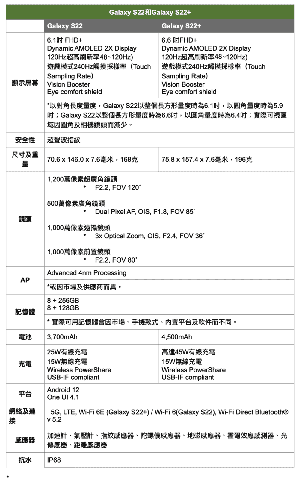 ▲熒幕方面,S22 及 S22+ 採用的是平面設計的 Dynamic AMOLED 2X,分別是 6.1 吋及 6.6 吋,解像度均為 FHD+。