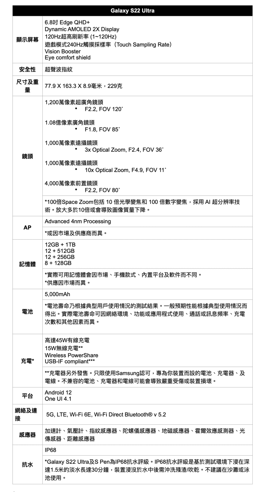 最後硬件配置方面,3 部全新 S22 系列旗艦手機,都用上了 Qualcomm 最新推出,採用 4nm 製程的 Snapdragon 8 Gen 1 處理器,S22 及 S22+ 內建了 8GB RAM 及 128GB / 256GB 內置儲存空間,而 S22 Ultra 就內建了 8GB / 12GB RAM 及 128GB / 256GB / 512GB / 1TB 內置儲存空間,電量方面 S22、S22+ 及 S22 Ultra 分別為 3,700mAh、4,500mAh 及 5,000mAh。這個硬件配置,基本上已足夠作為主力機使用,應付日常生活中的應用甚至用來打機理論上都不會有太大問題。顏色方面,S22 設有霧光黑、霧光白及粉紅金 3 隻顏色;S22+ 就設有霧光黑、霧光白及森林綠色;至於 S22 Ultra 就除了霧光黑及霧光白外,更設有十分吸引的森林綠色及暗酒紅色,未知大家又是否喜歡呢?