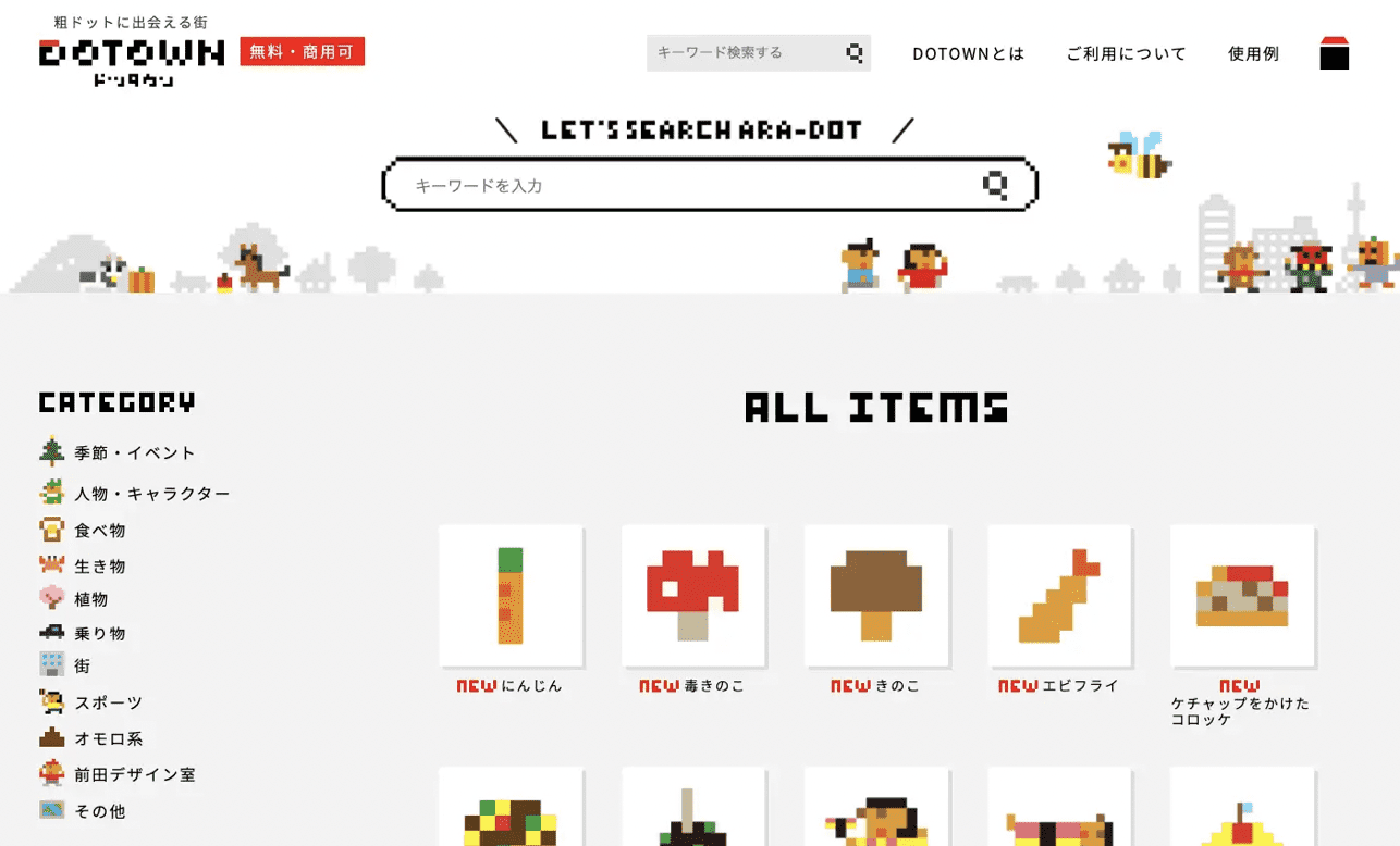 「DOTOWN(ドッタウン)」提供季節、人物、生物、植物、運動、食物、載具、街道等多個類別的粗點陣圖素材供用家下載。雖然網站開放 700 種素材供用家自由下載,但不能將素材用作違反公共秩序與道德、有損素材形象的行為,亦不能直接將素材製成商品二次販售。