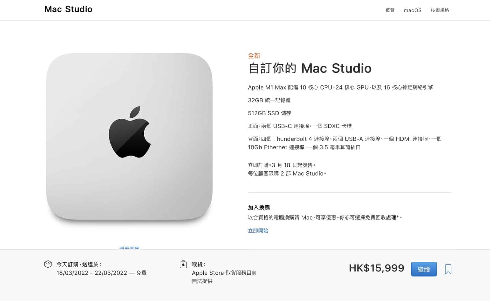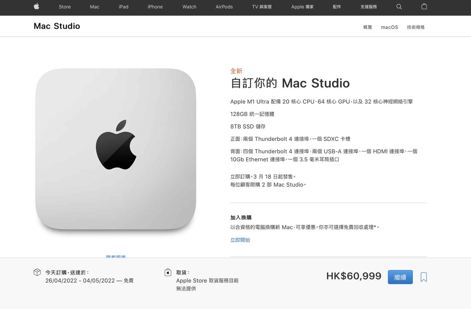 另可選配 M1 Ultra 20核心 CPU, 64 核心 GPU, 32 核心神經網絡引擎 +$7,500
